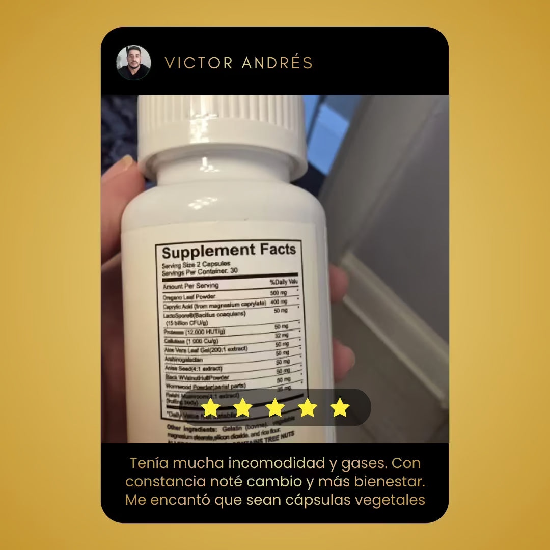 Incluye una mezcla con extracto de ajo, orégano, nuez negra, además de probióticos y enzimas digestivas.