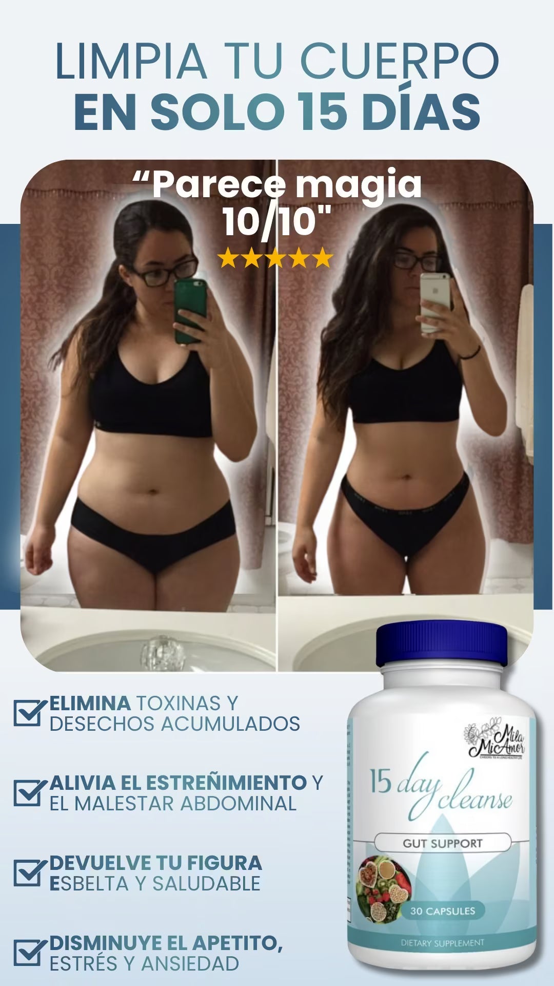 Conoce cómo 15 Day Cleanse acompaña rutina digestiva, ayuda a sentirte más ligera, baja sensación de pesadez y apoya bienestar general real en 15 días.