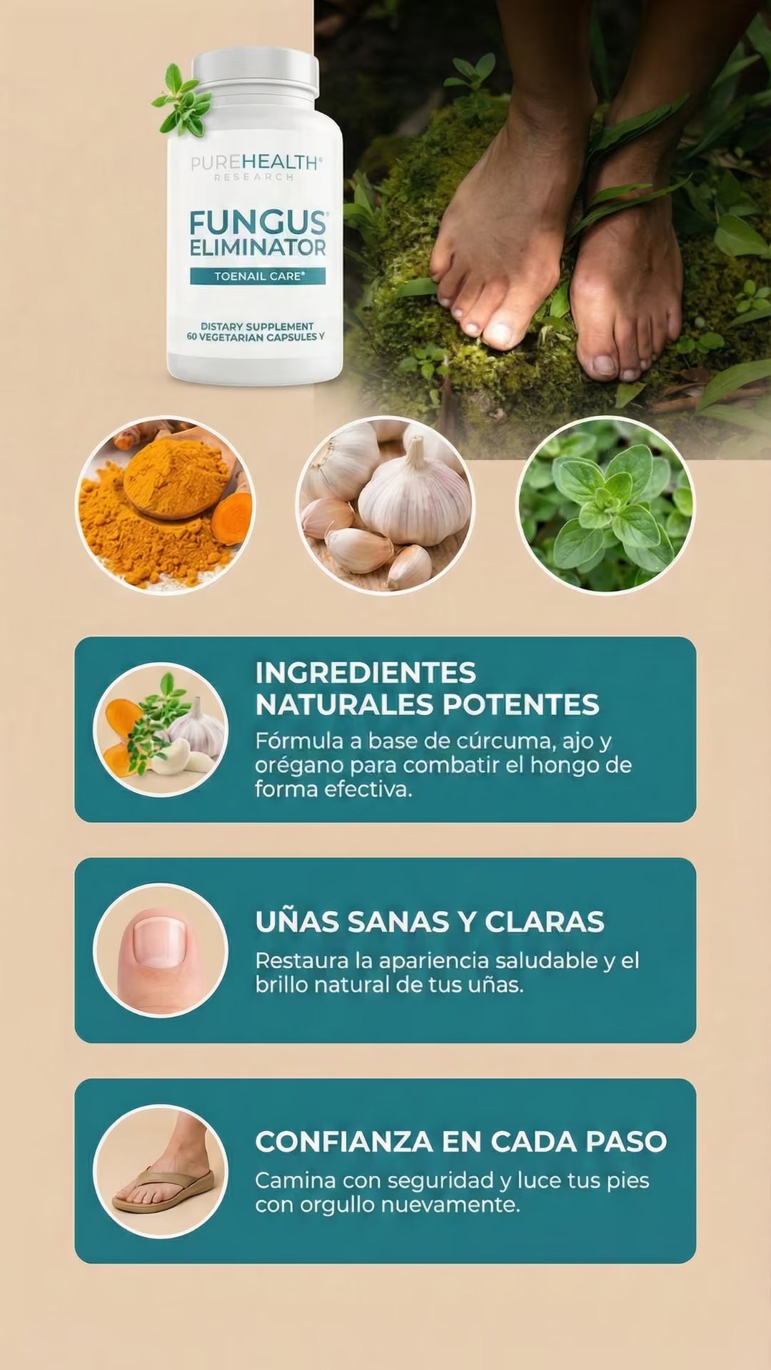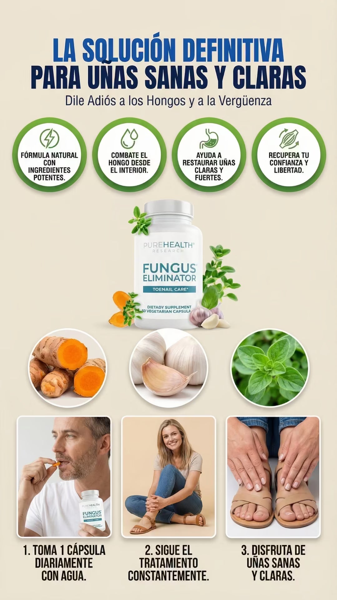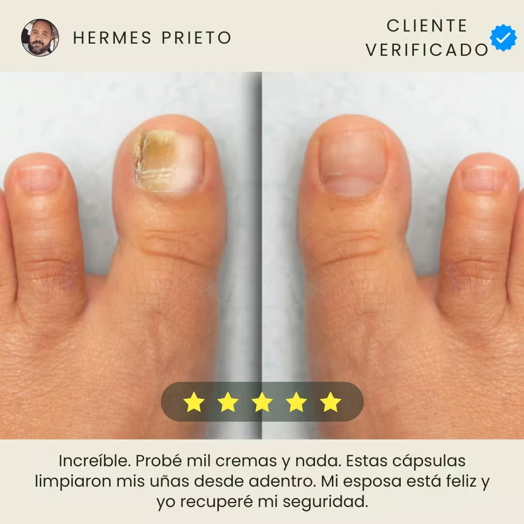 Clear Nails es un tratamiento oral avanzado que combate los hongos de las uñas desde el interior. Su potente mezcla natural de Cúrcuma, Orégano y Ajo elimina la infección de raíz, restaura el color saludable y fortalece la uña, permitiéndote recuperar la estética de tus pies y tu confianza personal.