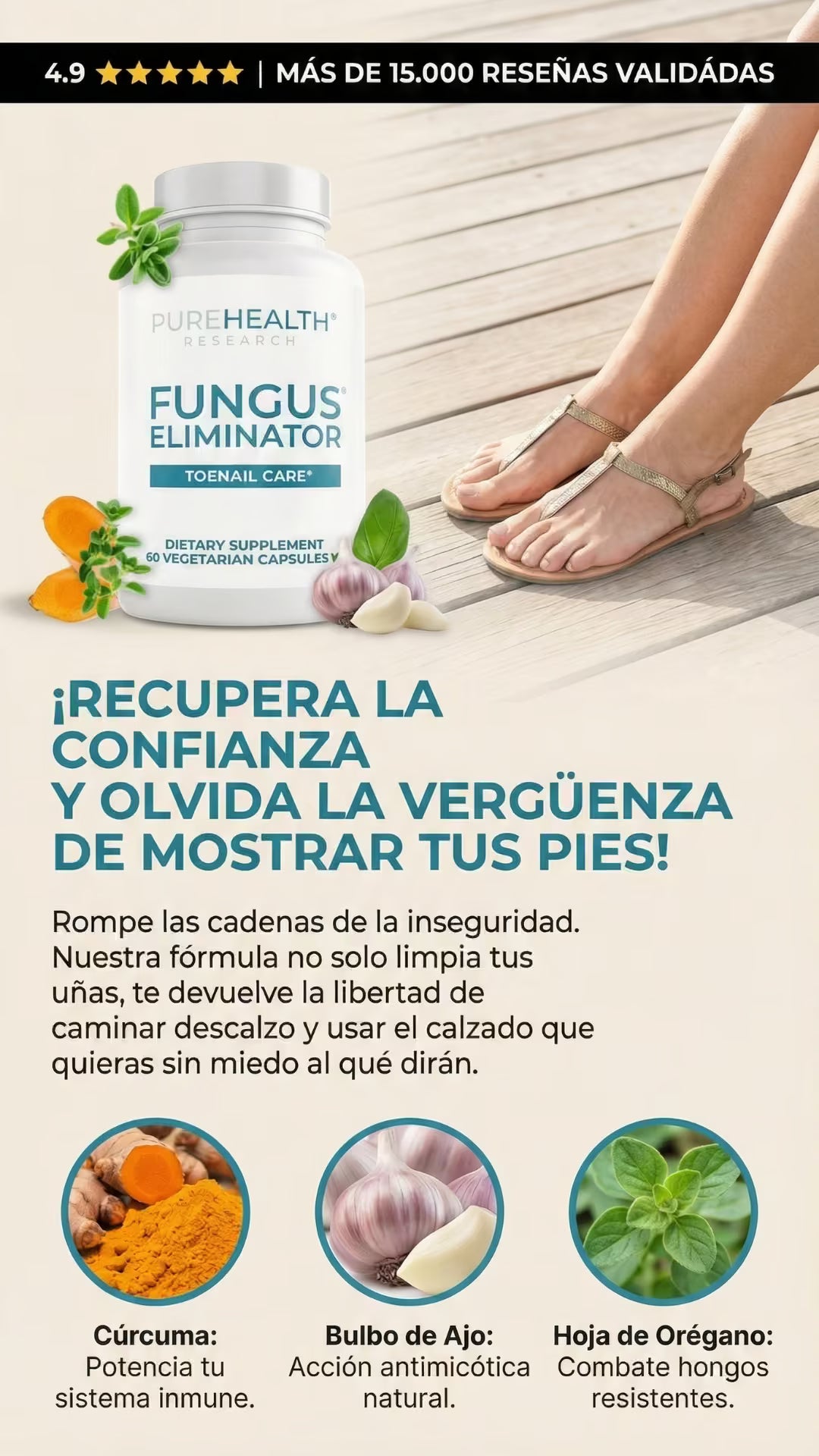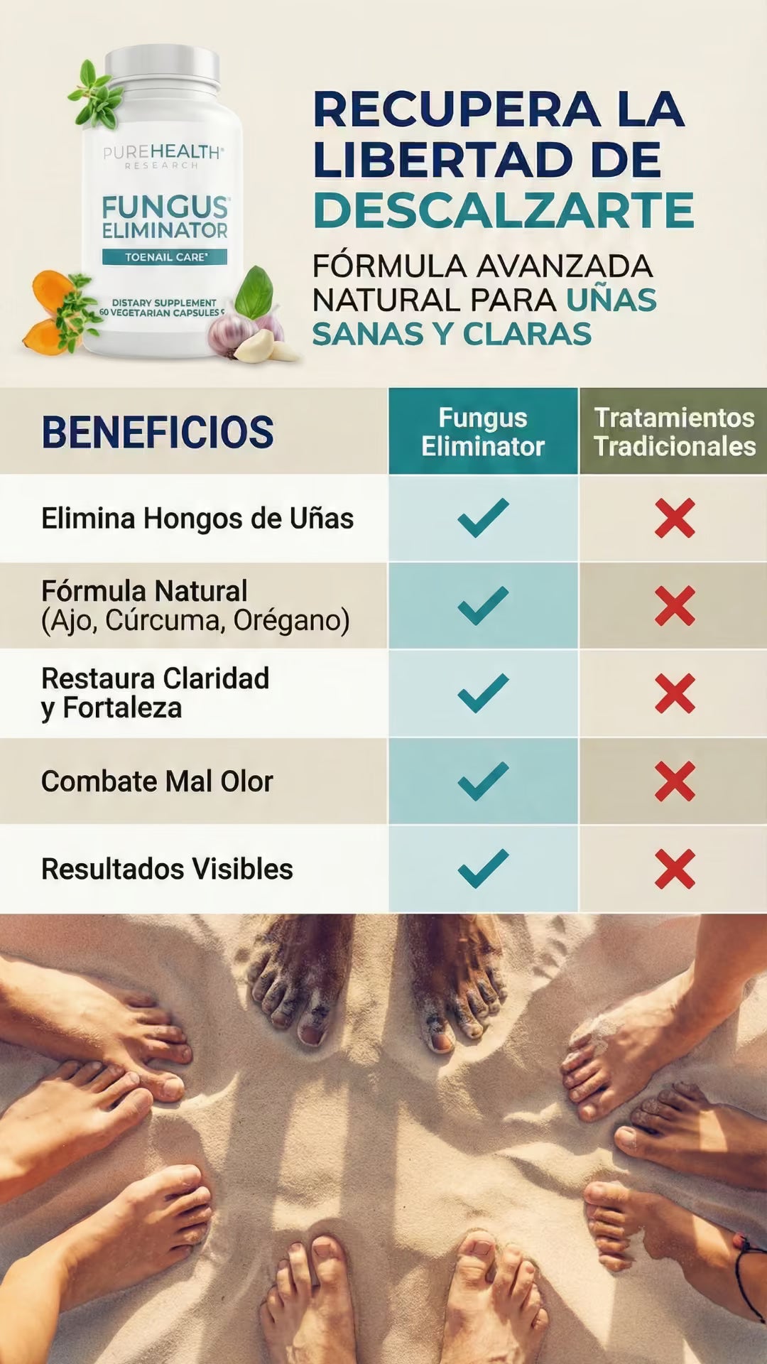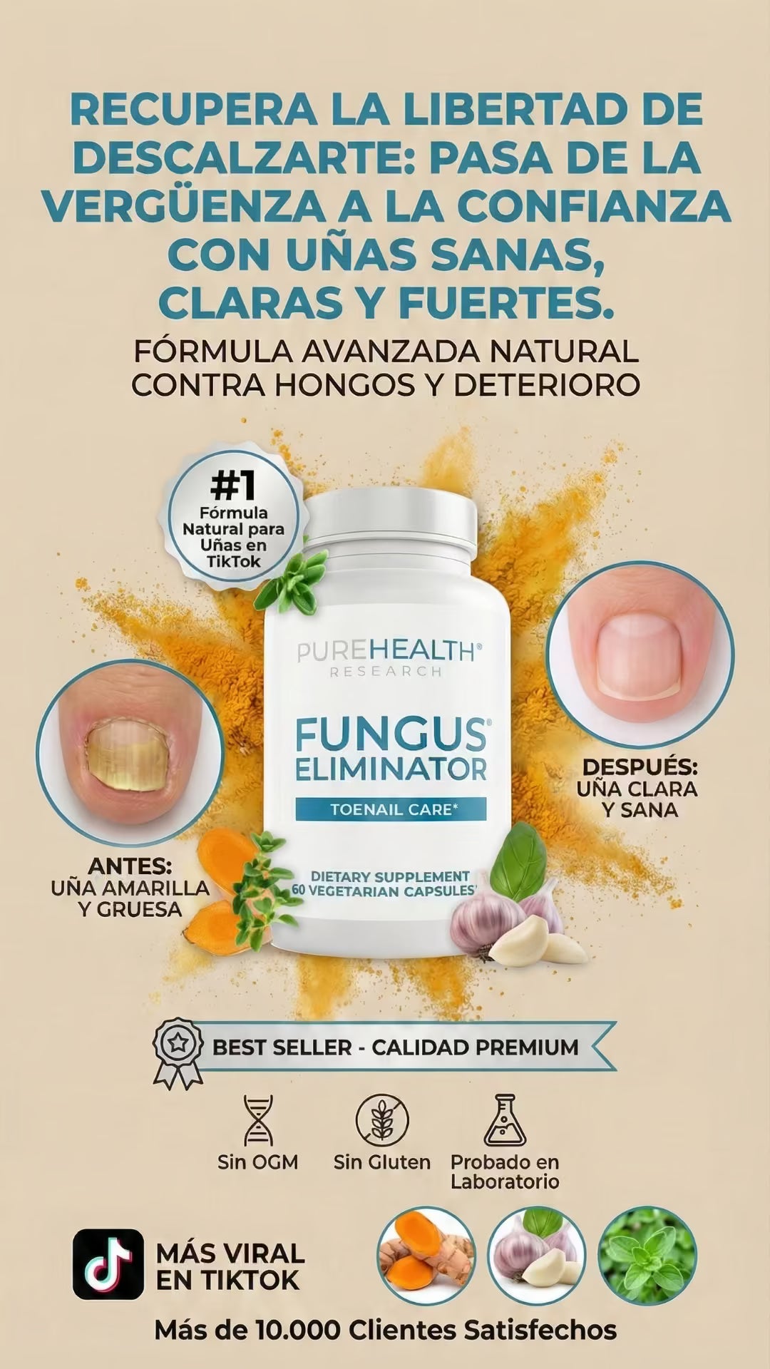 Clear Nails es un tratamiento oral avanzado que combate los hongos de las uñas desde el interior. Su potente mezcla natural de Cúrcuma, Orégano y Ajo elimina la infección de raíz, restaura el color saludable y fortalece la uña, permitiéndote recuperar la estética de tus pies y tu confianza personal.