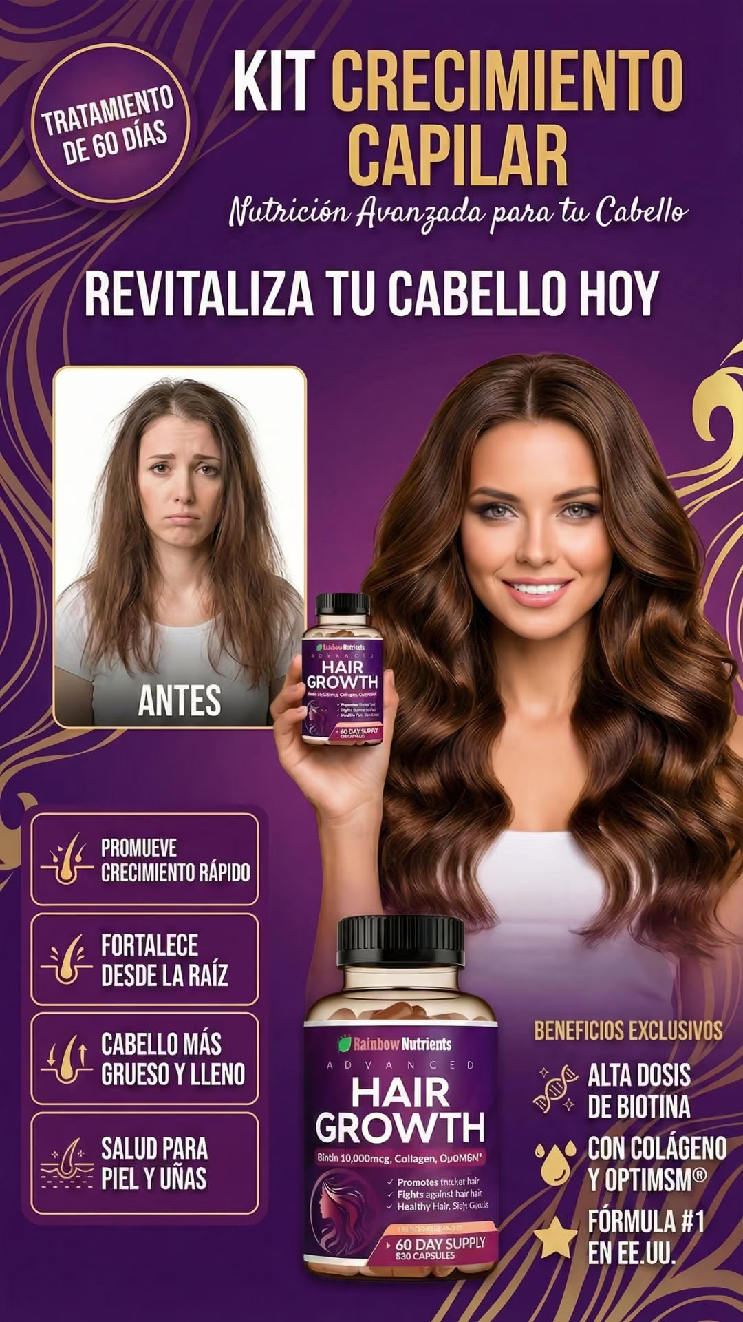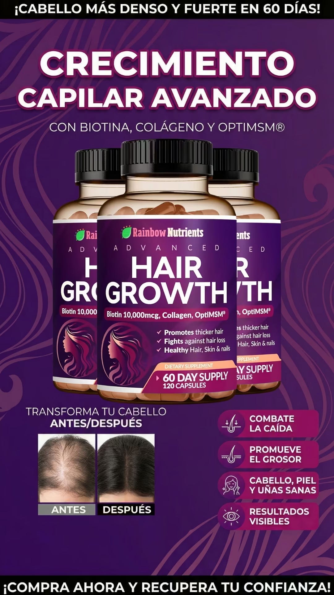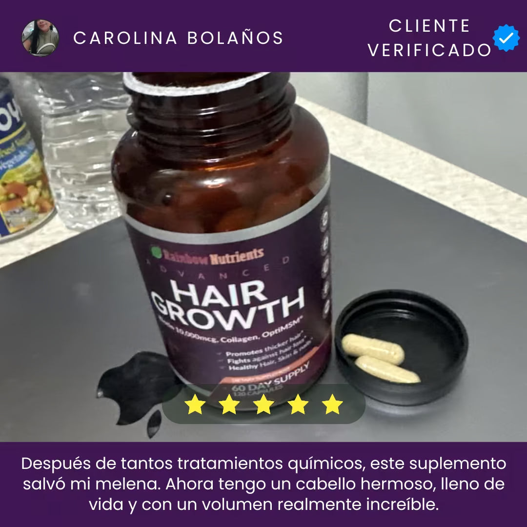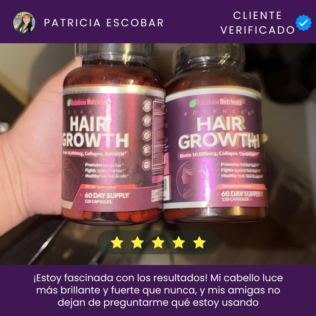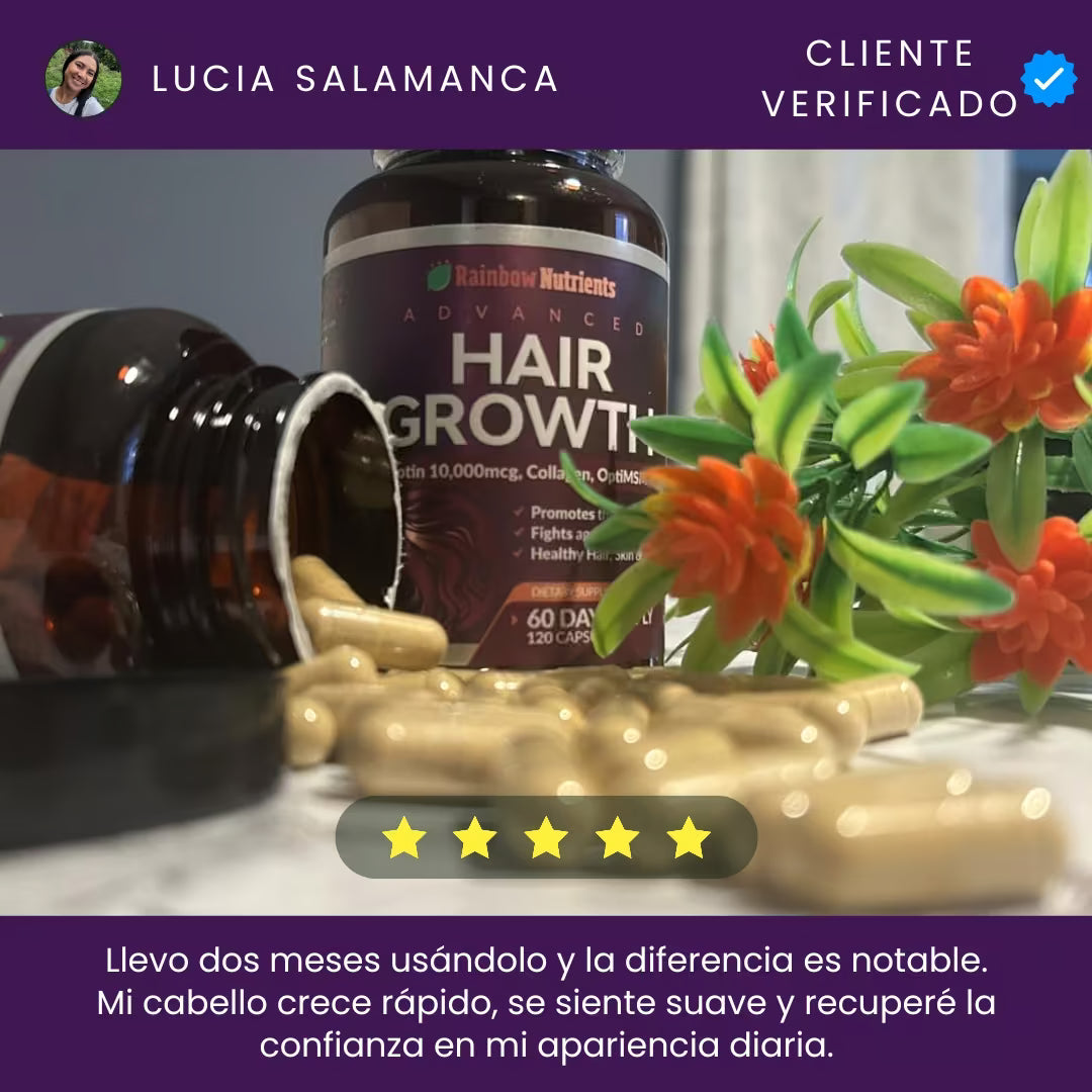 Rainbow Nutrients Hair Growth es un suplemento premium Non-GMO fabricado en EE. UU., diseñado para mujeres. Con 10,000 mcg de biotina y colágeno, combate la caída, fortalece uñas y mejora la piel. Incluye suministro para 2 meses y garantía de devolución de 60 días. ¡Nutrición total sin riesgos!