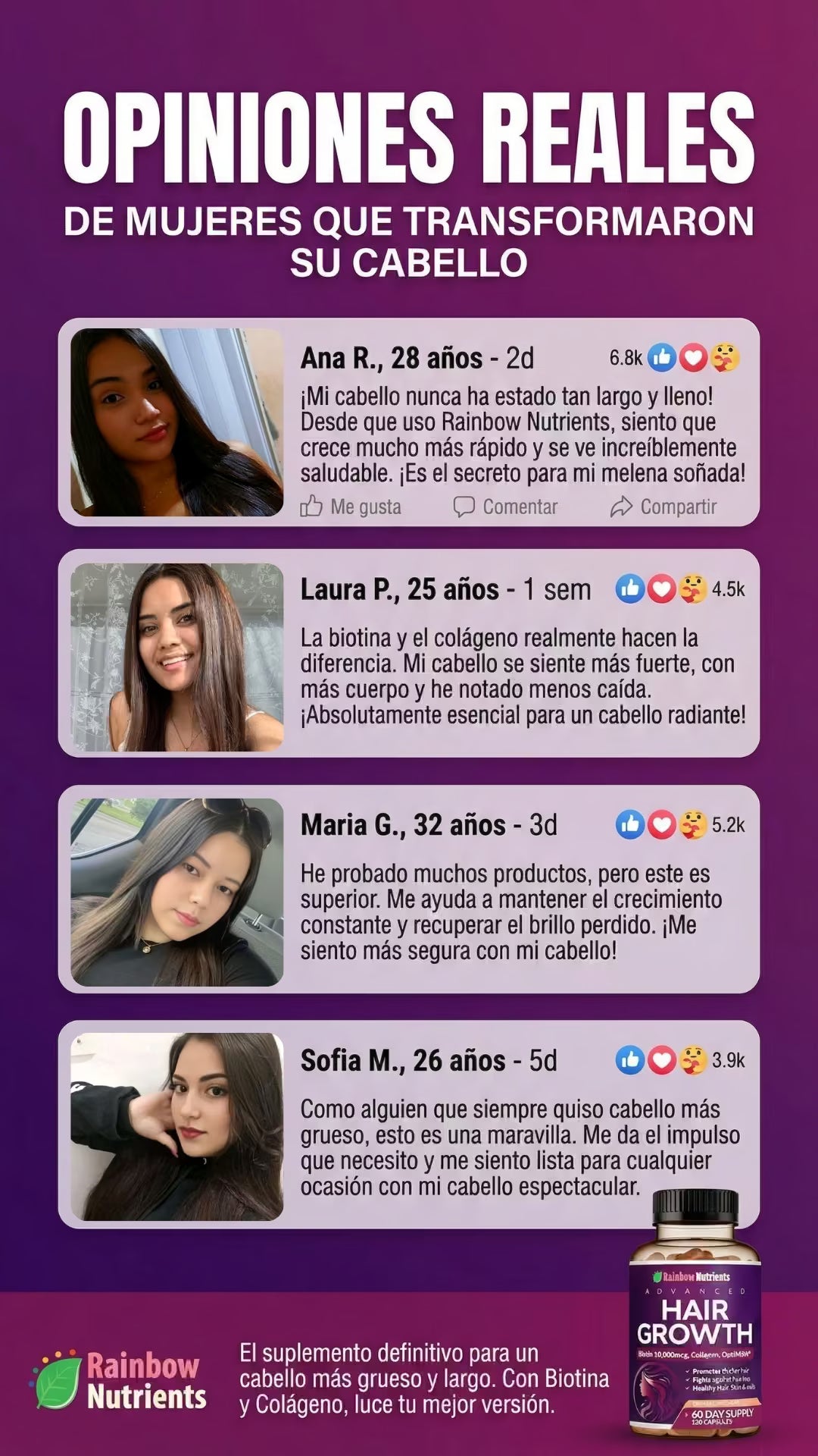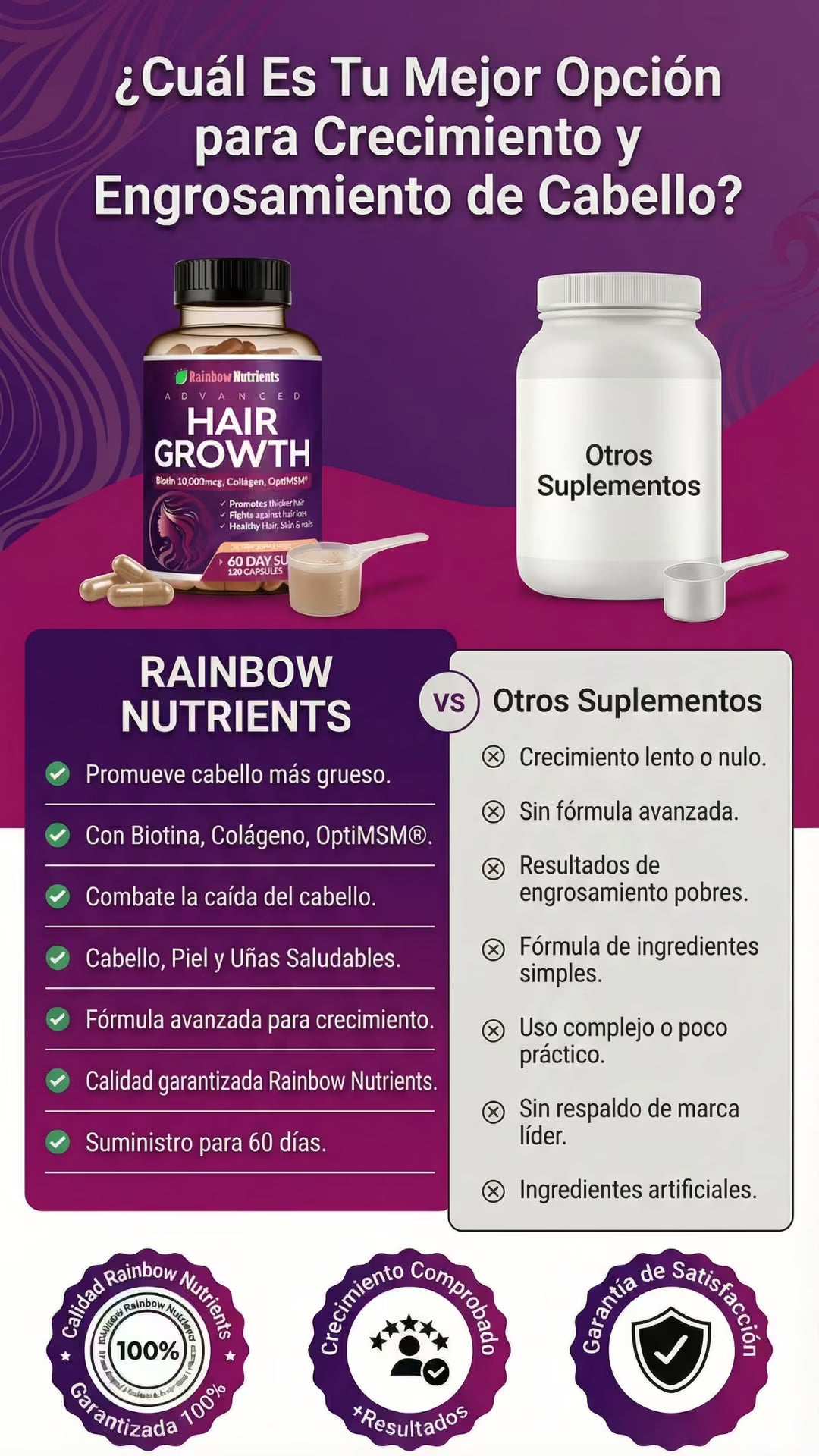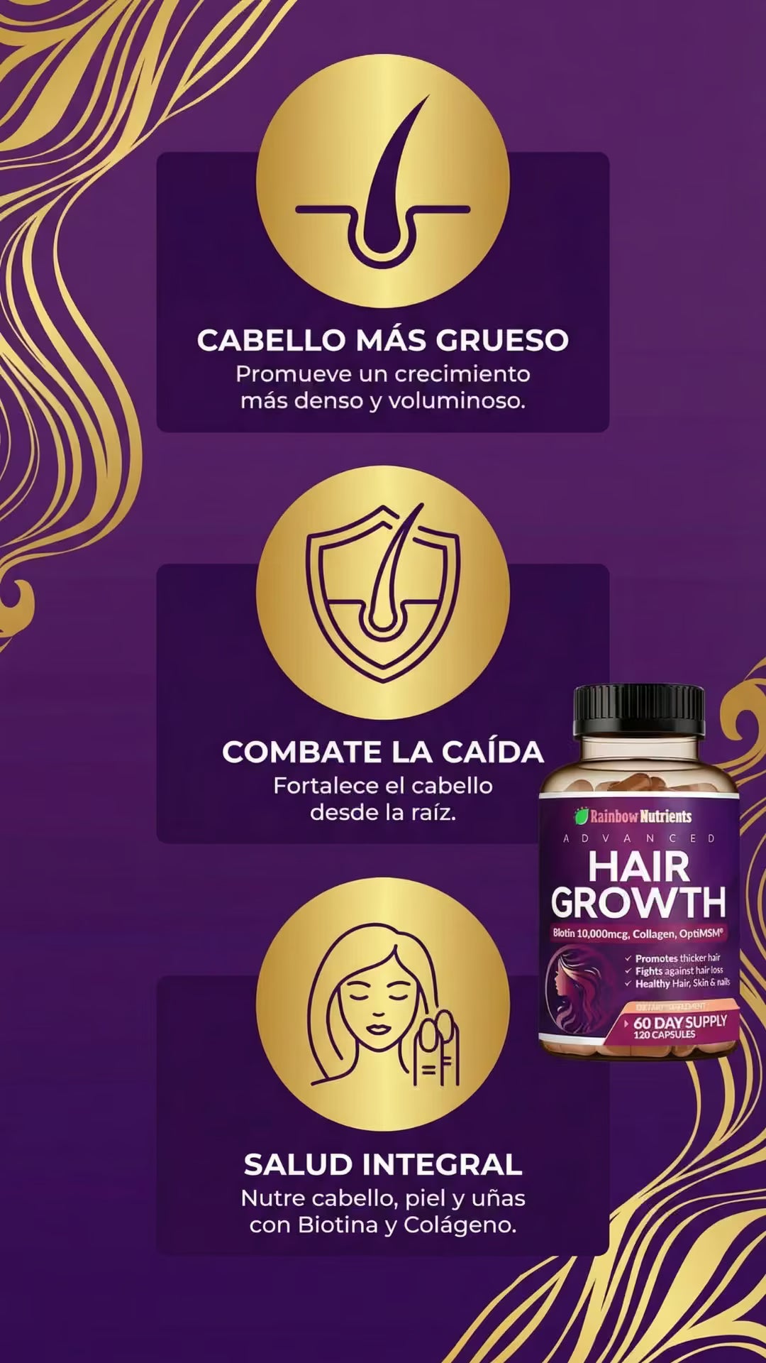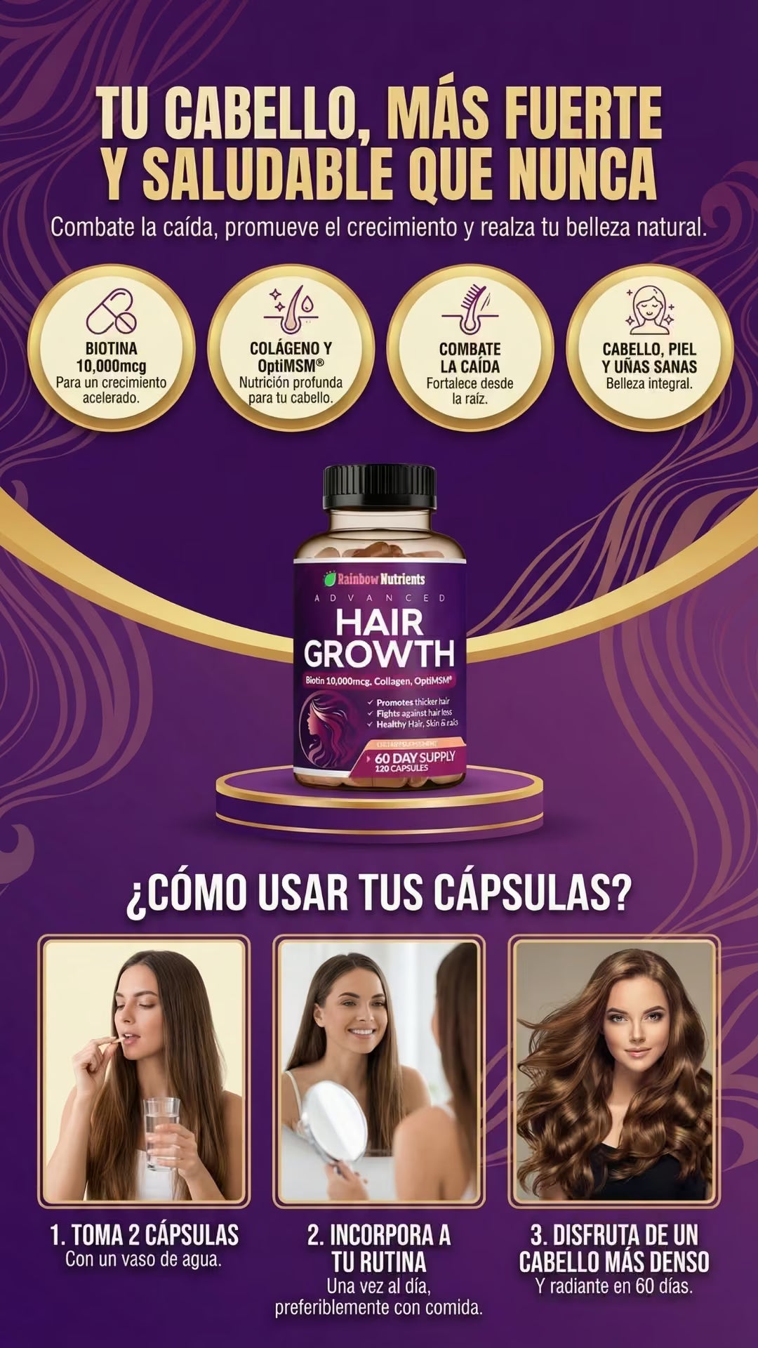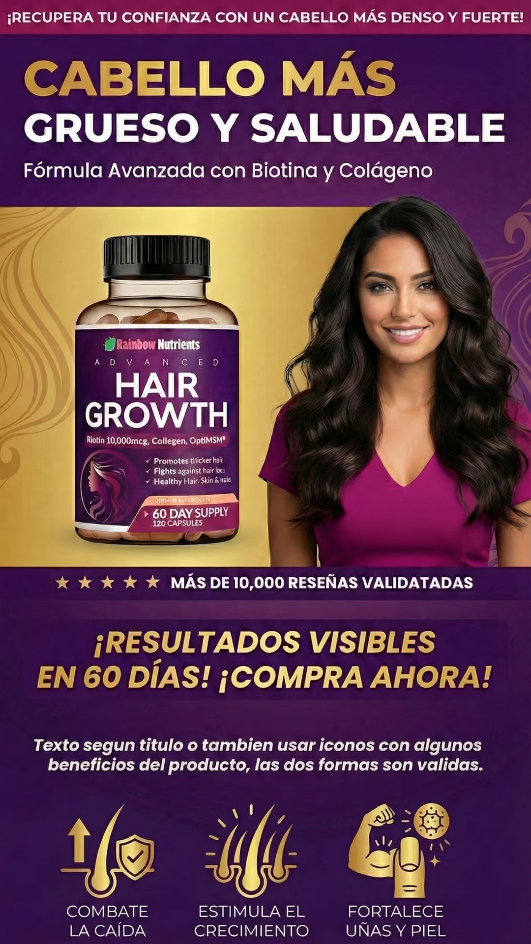 Rainbow Nutrients Hair Growth es un suplemento premium Non-GMO fabricado en EE. UU., diseñado para mujeres. Con 10,000 mcg de biotina y colágeno, combate la caída, fortalece uñas y mejora la piel. Incluye suministro para 2 meses y garantía de devolución de 60 días. ¡Nutrición total sin riesgos!