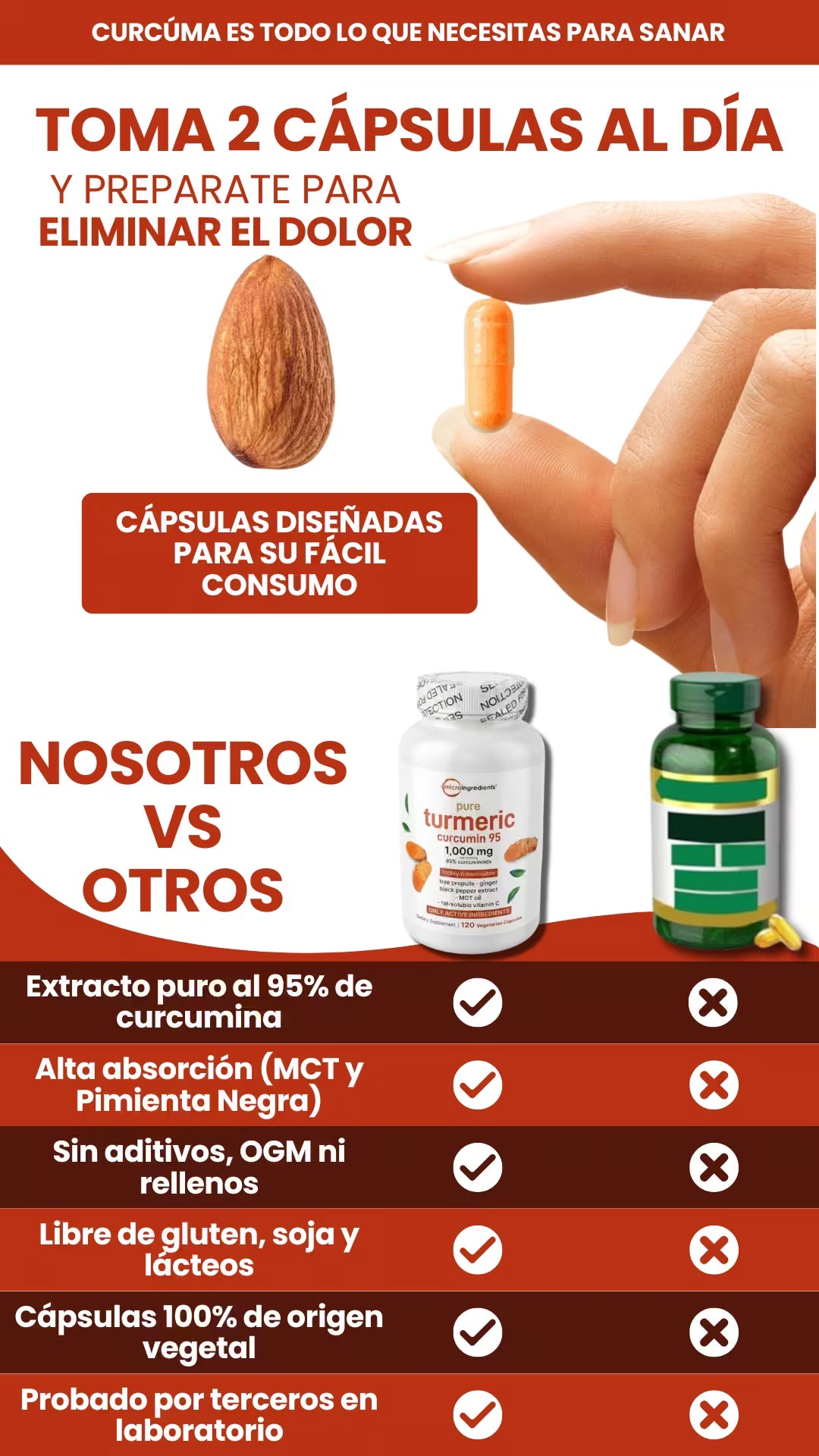 Porque contiene un 95% de curcuminoides puros y extractos especiales que garantizan su absorción en el cuerpo, a diferencia del polvo común.
