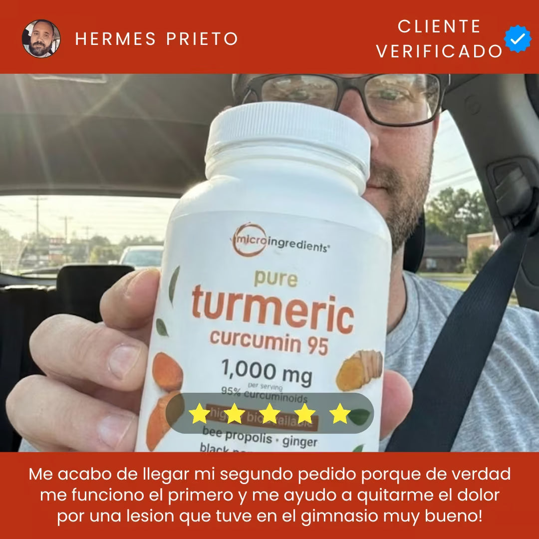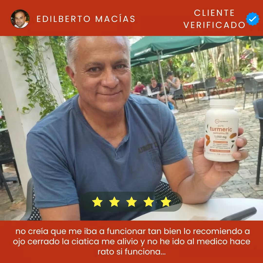 Nuestro complejo de cúrcuma curcumina es un potente suplemento natural diseñado para eliminar el dolor articular y la inflamación. Contiene noventa y cinco por ciento de extracto puro y se absorbe rápidamente. Sirve para recuperar la movilidad, calmar la ciática y proteger tus articulaciones sin dañar tu sistema digestivo diariamente.