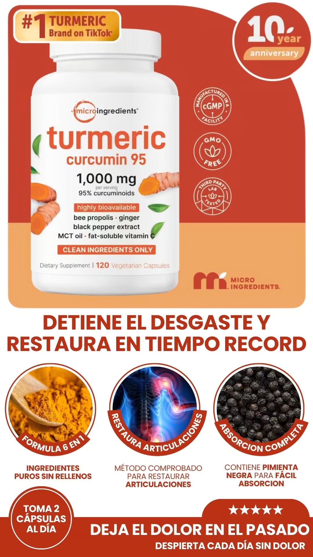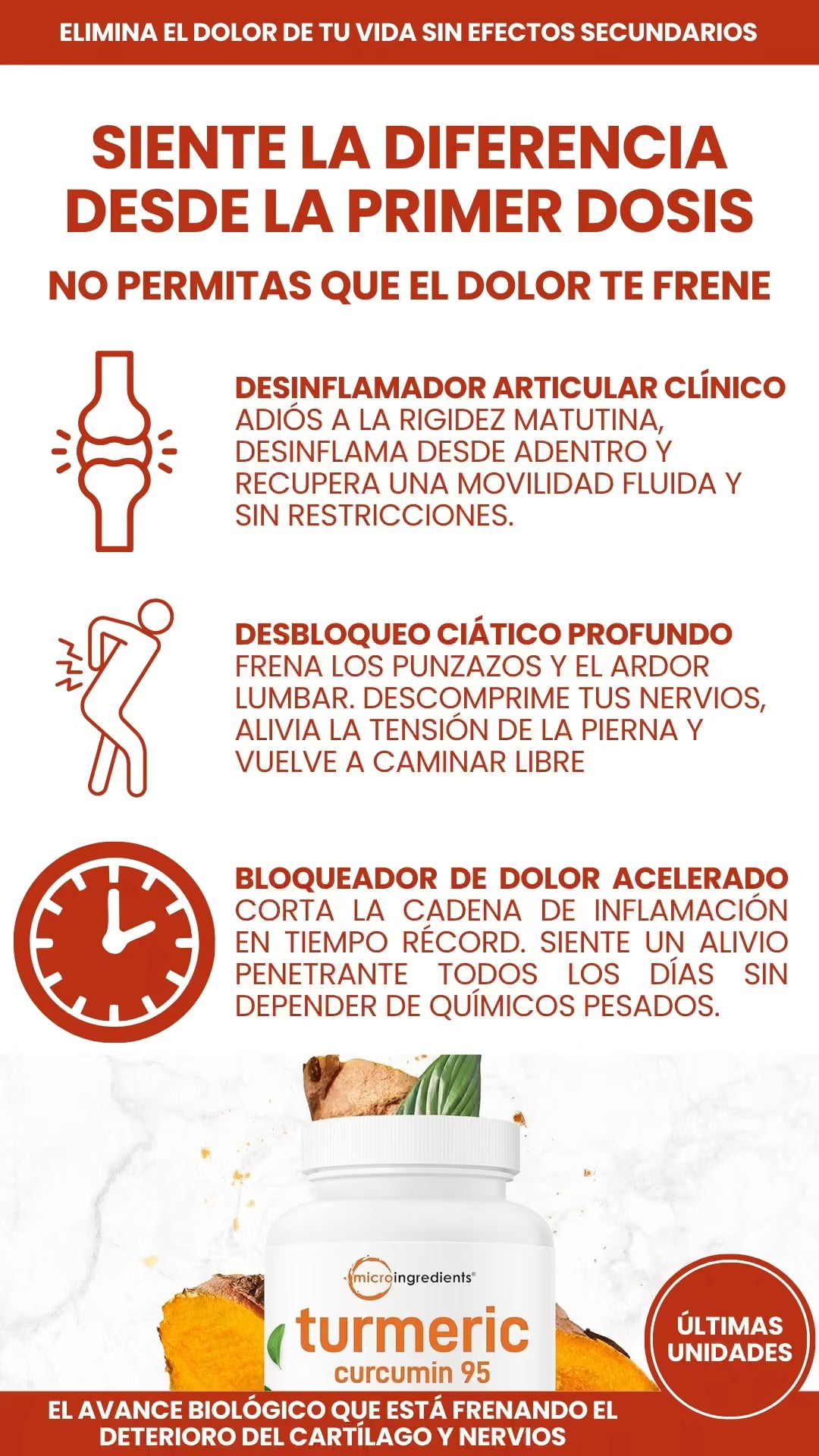 Descubre cómo nuestro Complejo de Cúrcuma apaga la inflamación, combate el bloqueo articular y te devuelve la movilidad desde la primera semana.